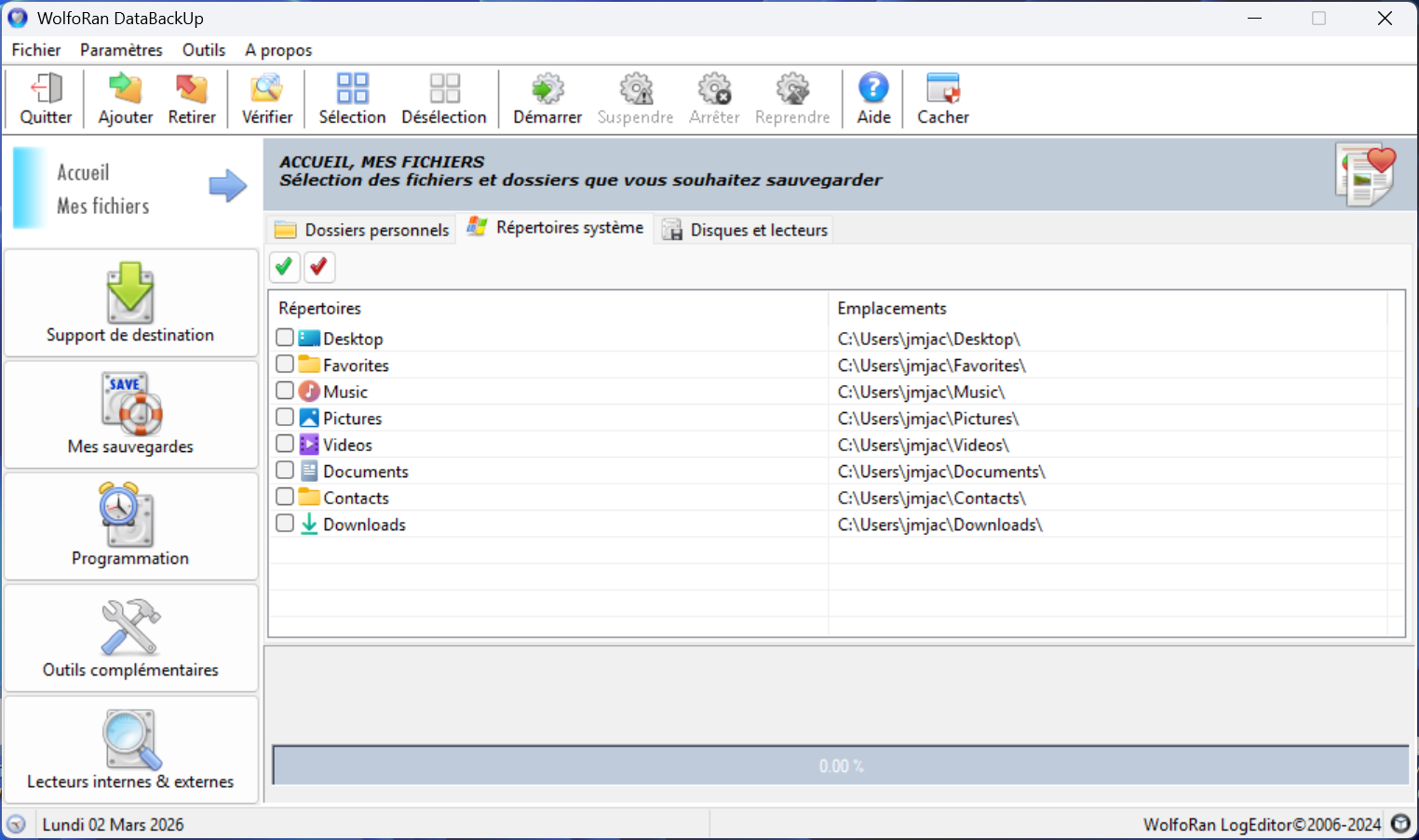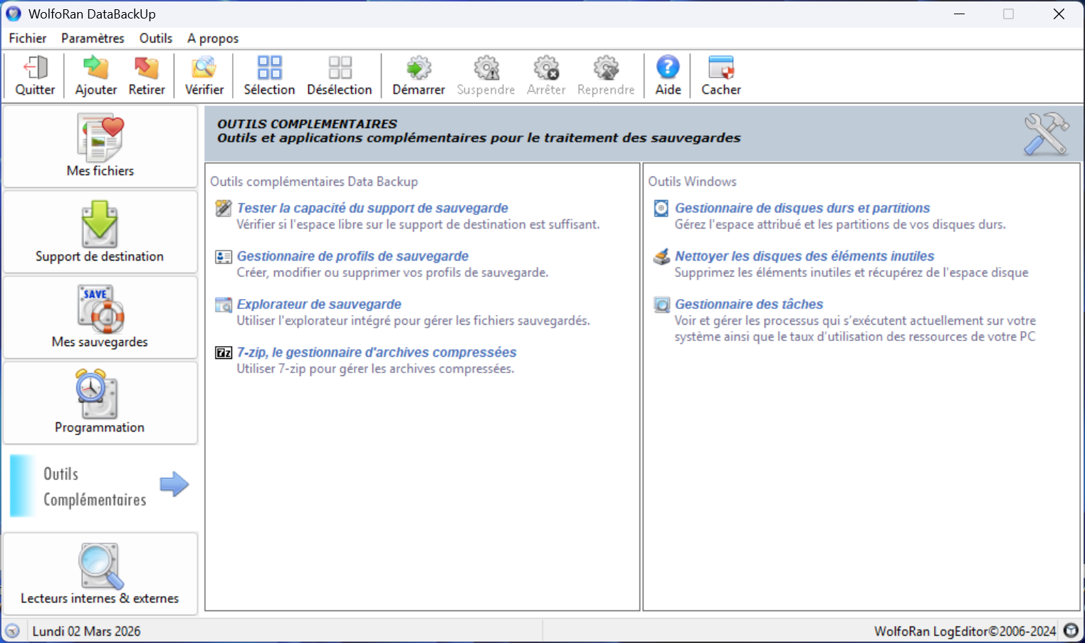La sauvegarde intelligente de vos fichiers. Notre solution de sauvegarde est résolument simple à utiliser, puissante et entièrement automatisée pour ceux qui ne souhaitent pas se soucier de la pérennité de leurs fichiers. WolfoRan Data Backup sauvegarde vos fichiers en conservant la structure des répertoires où ils se trouvent pour une restauration simplifiée et rapide. Nous recommandons vivement l'utilisation d'un disque dur externe.