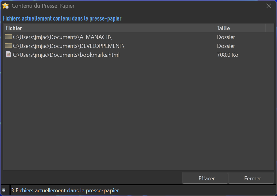 En cliquant sur le bouton "Voir le contenu du presse-papier" une fenêtre affichant les fichiers et dossiers qui ont été copiés. L'utilisateur peut les y conserver ou encore les effacer.