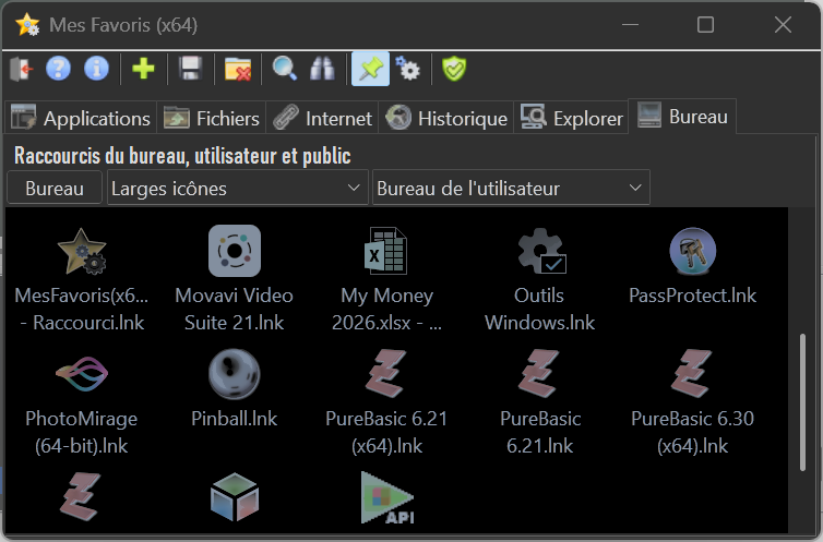 1. Ajout et suppression de raccourcis vers chaque catégorie, organisés sous forme de listes enregistrées dans des fichiers textes (3 listes : Applications, fichiers et dossiers et liens vers des sites internet)