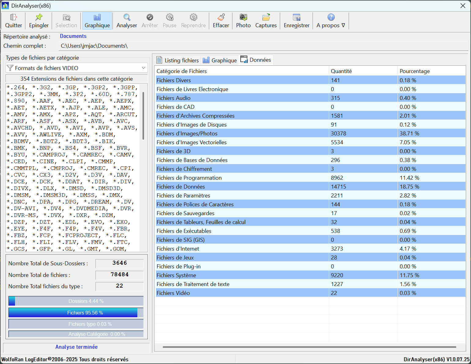 9478 extensions de fichiers sont reconnues.Très facile d’utilisation, il suffit de sélectionner un répertoire, de choisir la catégorie de fichiers à comptabiliser parmi les 25 catégories disponibles, et cliquer sur « Analyser ».