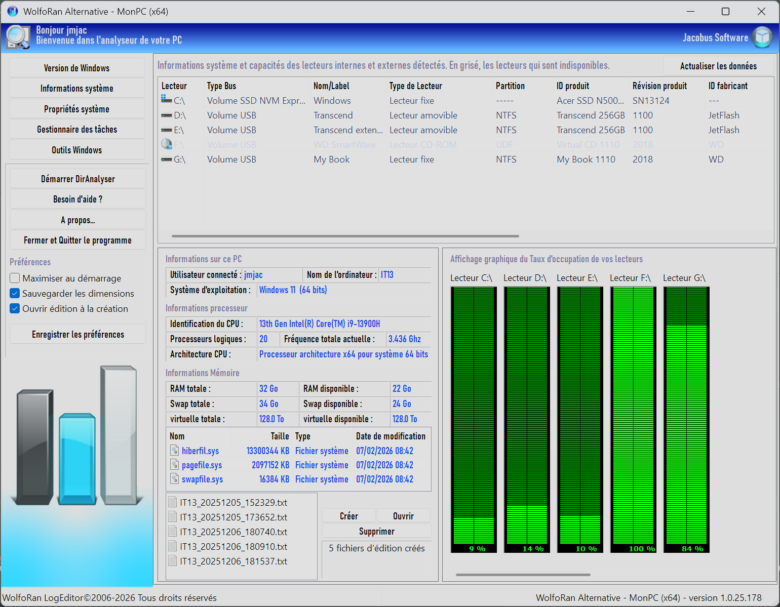 - Informations sur les disques durs, lecteurs internes et externes et affichage graphique de leur pourcentage d'utilisation.