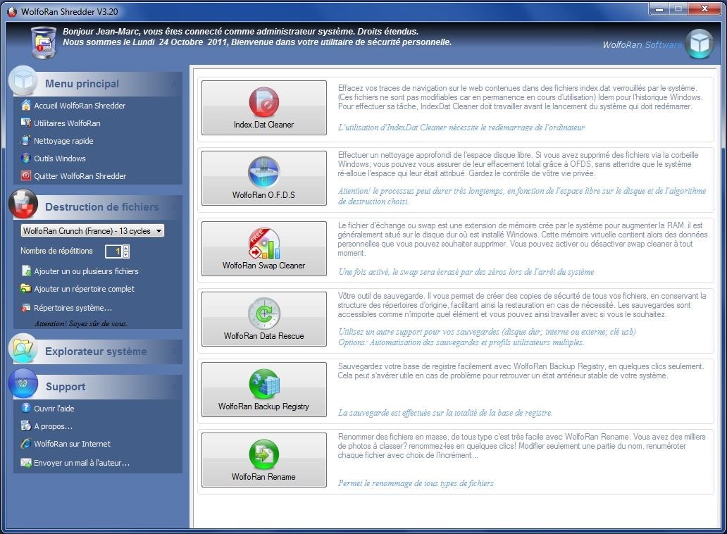 By one of the main interface button, you can view WolfoRan Shredder options you offer additional powerful cleaning tools including: