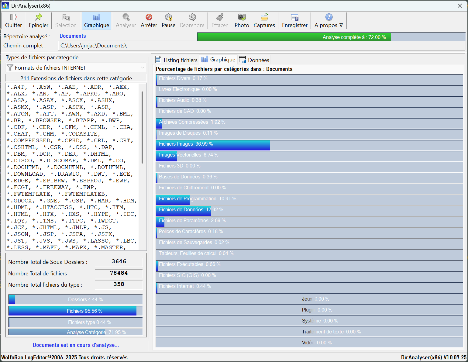 9478 extensions de fichiers sont reconnues.Très facile d’utilisation, il suffit de sélectionner un répertoire, de choisir la catégorie de fichiers à comptabiliser parmi les 25 catégories disponibles, et cliquer sur « Analyser ».