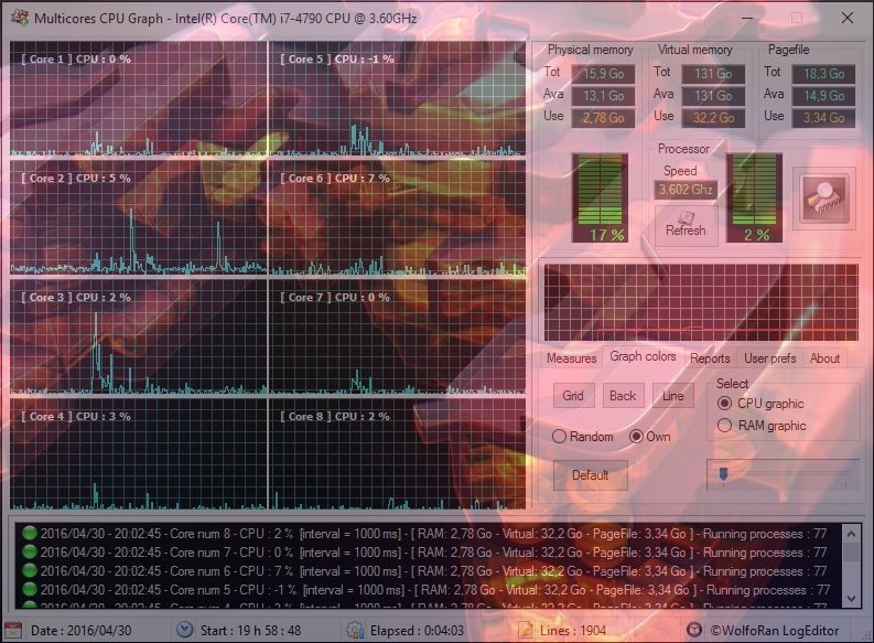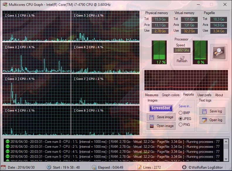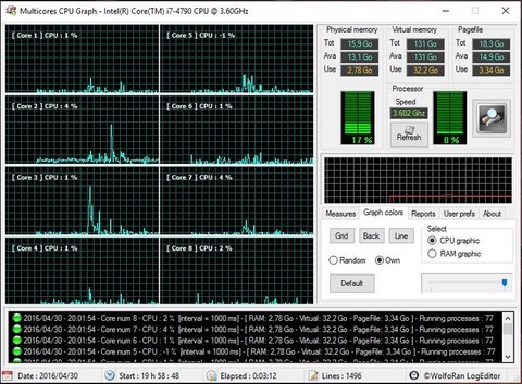 Only for processor: 1, 2, 4 or 8 logical cores. Initially designed for programmers to test their applications by observing the behavior of the processor and memory, this software can be used for everyone to monitor its CPU. It is possible to take the catch and graphics to create reports in the form of logs CPU usage over time.