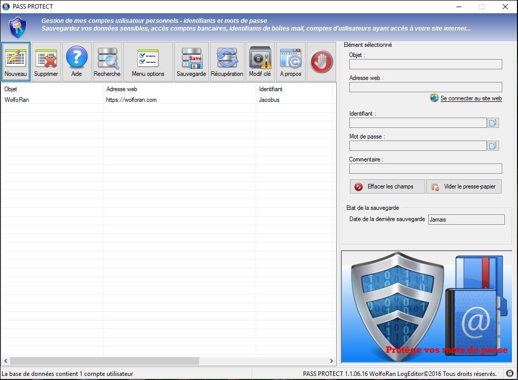 Application management and backup passwords, user accounts and other login data, stock Pass Protect and secure your data. Simple and intuitive it allows you to store only one password to easily find all the others. Non-intrusive, portable, it can be installed on a USB key or an external drive to follow you wherever you need them. No more code storage chore.