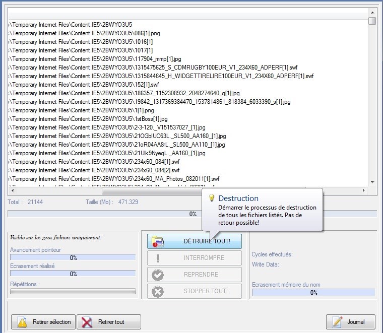 The destruction of files and folders is recursive, that is, everything is deleted, even the hidden elements to some directories. So be sure what you are doing, because it can permanently remove all data from a hard drive, a USB key or floppy disk. On error, you can pause and stop the destruction process at any time but be aware that any file whose crushing process has been initiated will be lost definitively pass is sufficient to render it unusable.